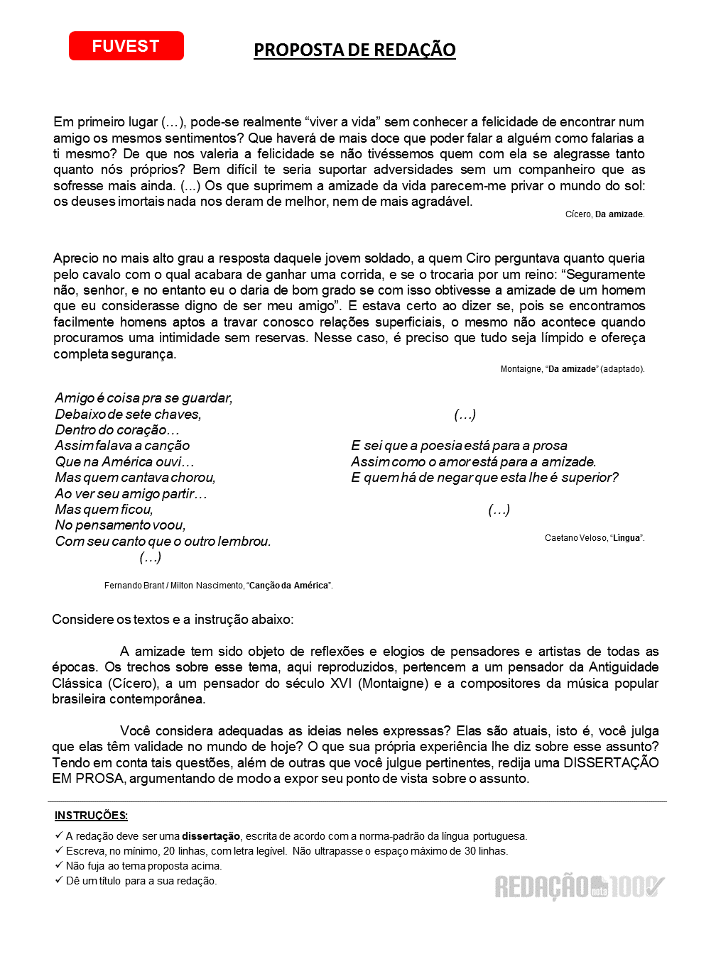 WebORIENTAÇÕES. 1. Redija seu texto de acordo com a norma culta escrita da língua. 2. O texto não pode ter mais de 20 linhas no Word. Você pode enviar seu texto. WebPROPOSTA DE REDAÇÃO. Levando em conta esse cenário, reflita sobre o tema a seguir: na sua opinião, o que é amizade nos dias de hoje? Para tanto, você deve: - expressar a. WebEspecialistas afirmam que a amizade faz bem ao coração, combate a solidão e ainda ajuda na prevenção do mal de Alzheimer. A verdadeira amizade surge, na.