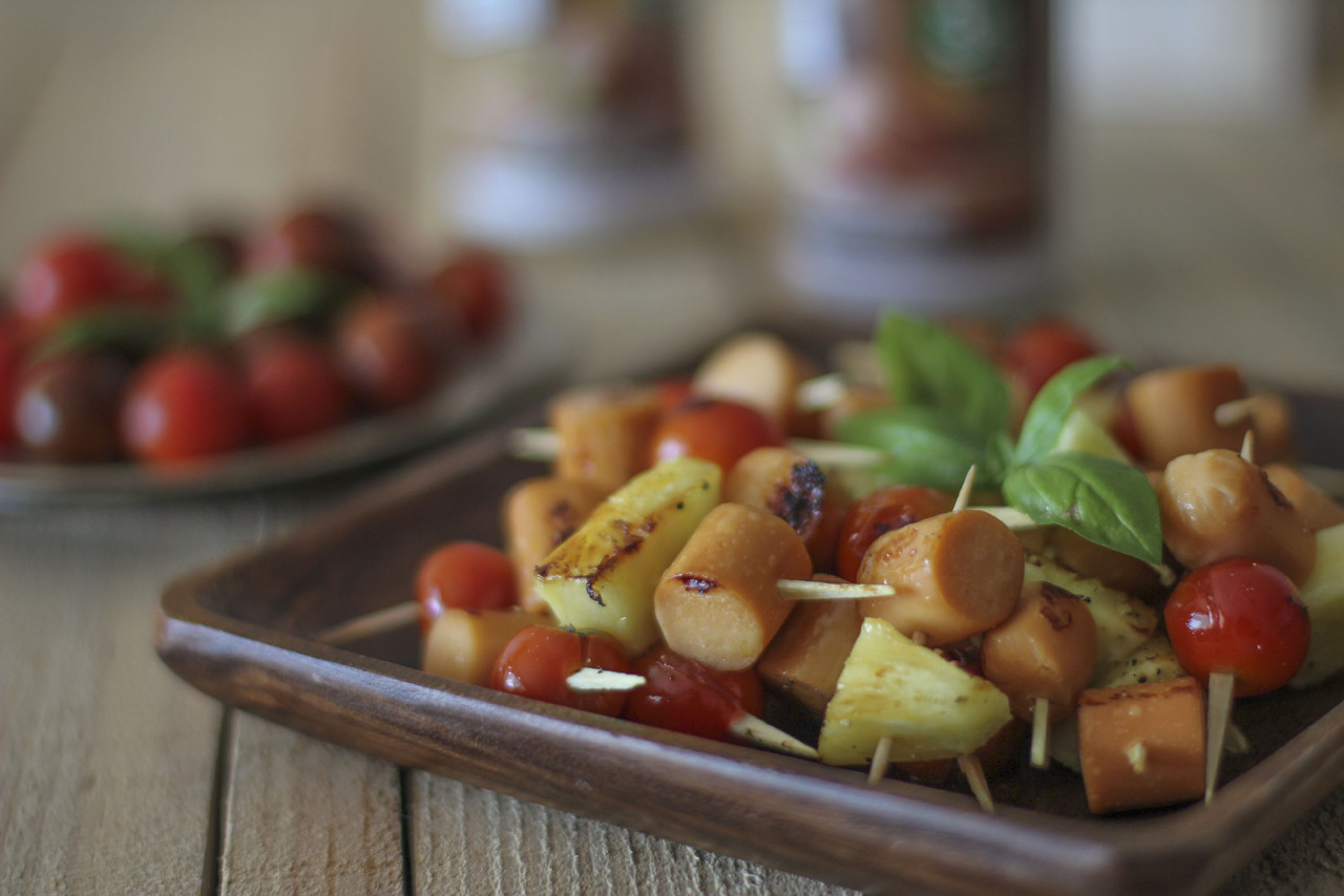 Tópicos Mini-espetadas de salsicha com tomate-cereja e abacaxi | SAPO Lifestyle